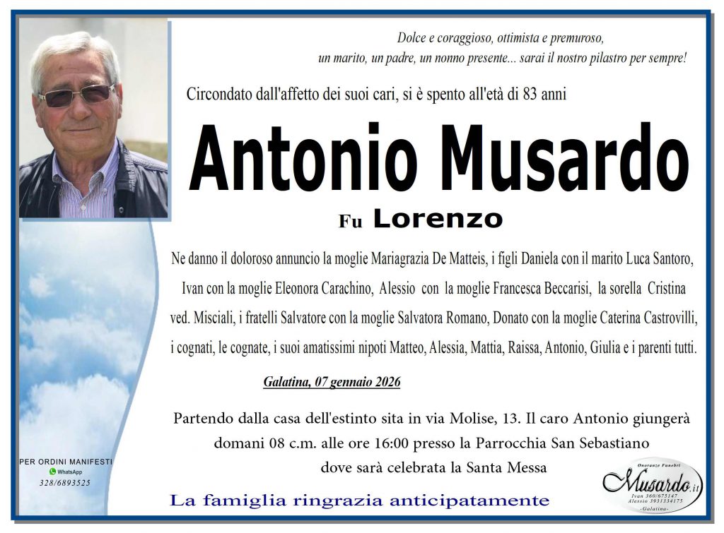7 gennaio 20267 gennaio 2026annunci, tutti Invia un messaggio di cordoglio alla famiglia Potete inviare messaggi di cordoglio alla famiglia compilando il modulo in basso. Saremo lieti di provvedere a consegnarlo personalmente, in forma cartacea, riservata e gratuita. Il tuo nome (richiesto) La tua email (richiesto) Nome e Cognome del Defunto (richiesto) Il tuo messaggio di Cordoglio (richiesto) Con l'invio si autorizza al trattamento dei dati inseriti, ai sensi del D.Lgs. n.196/2003