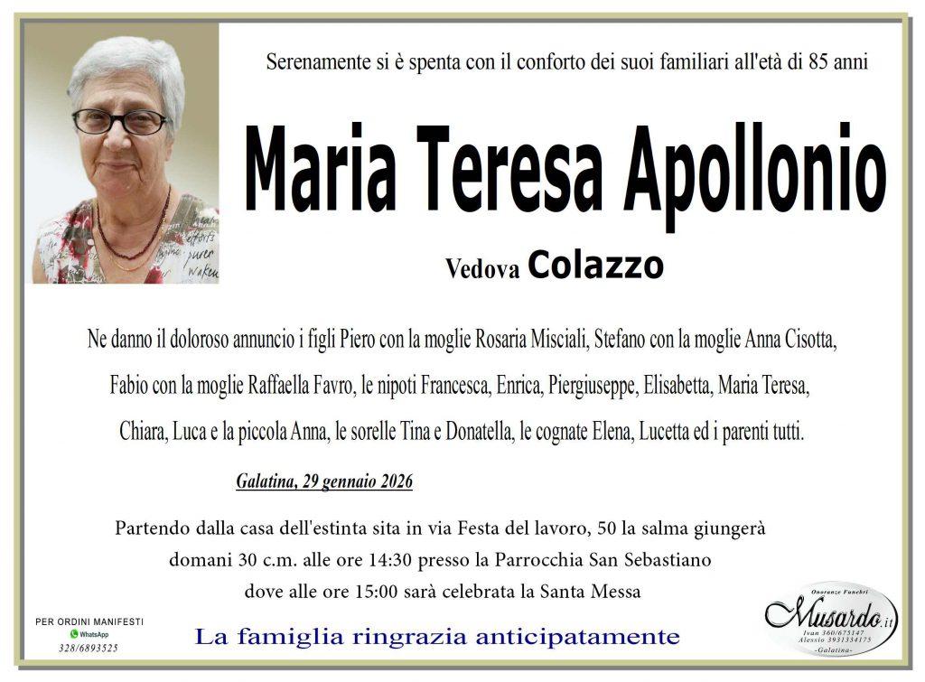 29 gennaio 202629 gennaio 2026annunci, tutti Invia un messaggio di cordoglio alla famiglia Potete inviare messaggi di cordoglio alla famiglia compilando il modulo in basso. Saremo lieti di provvedere a consegnarlo personalmente, in forma cartacea, riservata e gratuita. Il tuo nome (richiesto) La tua email (richiesto) Nome e Cognome del Defunto (richiesto) Il tuo messaggio di Cordoglio (richiesto) Con l'invio si autorizza al trattamento dei dati inseriti, ai sensi del D.Lgs. n.196/2003