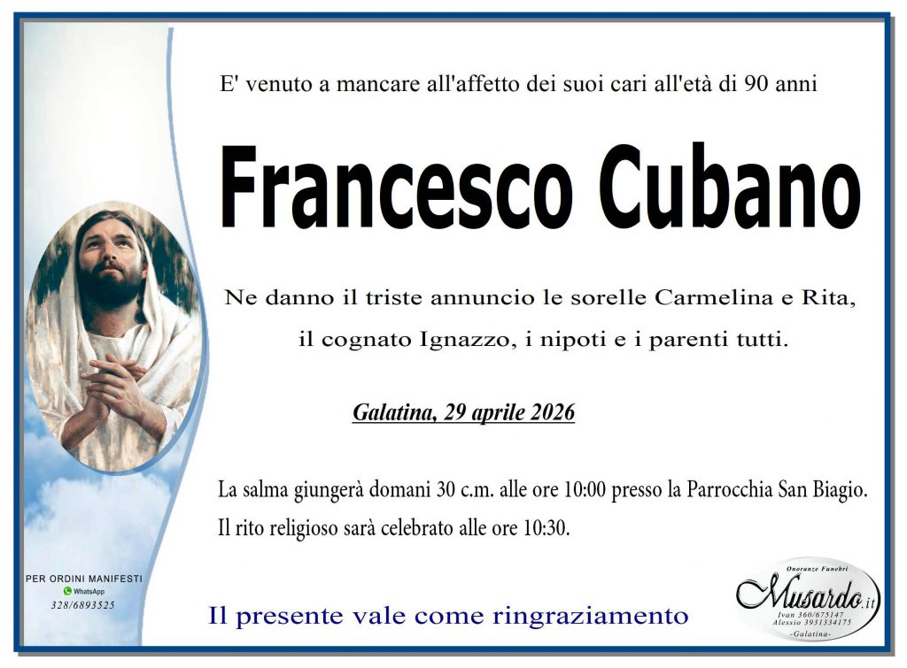 29 aprile 2026annunci, tutti Invia un messaggio di cordoglio alla famiglia Potete inviare messaggi di cordoglio alla famiglia compilando il modulo in basso. Saremo lieti di provvedere a consegnarlo personalmente, in forma cartacea, riservata e gratuita. Il tuo nome (richiesto) La tua email (richiesto) Nome e Cognome del Defunto (richiesto) Il tuo messaggio di Cordoglio (richiesto) Con l'invio si autorizza al trattamento dei dati inseriti, ai sensi del D.Lgs. n.196/2003